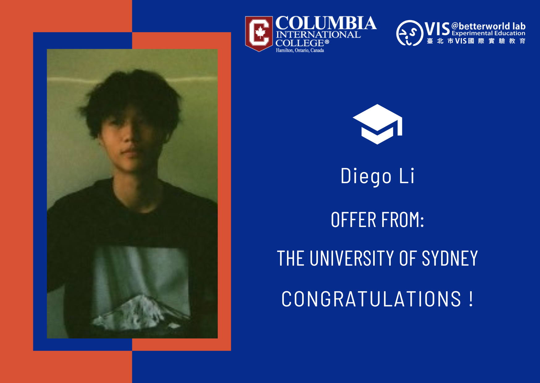 我們非常興奮地宣布,我們的學生 Diego Li,目前就讀於VIS在加拿大的夥伴學校 CIC,已獲雪梨大學(University of Sydney)錄取,即將展開商學學士的學習旅程!