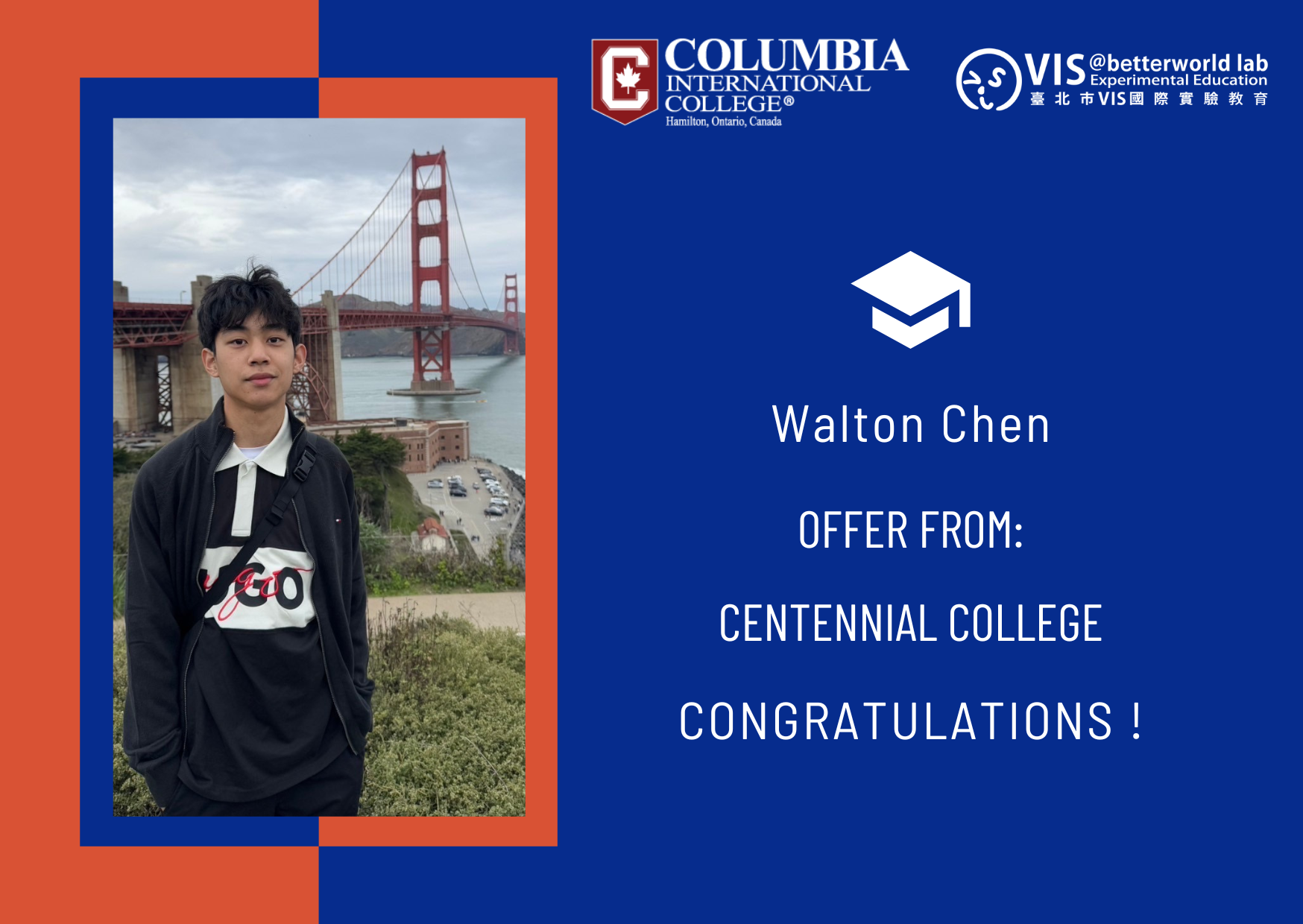 VIS 國際實驗教育捷報再傳!恭喜在加拿大夥伴學校 CIC 就讀的 12 年級學生 Walton Chen 獲得加拿大名校百年理工學院 (Centennial College) 航空技術員暨飛機維修專業 (Aviation Technician – Aircraft Maintenance) 錄取通知!