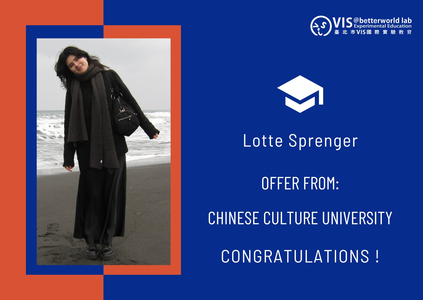 Congratulations to Lotte Sprenger, a Grade 12 student at VIS, on her acceptance into Chinese Culture University's International Business program!