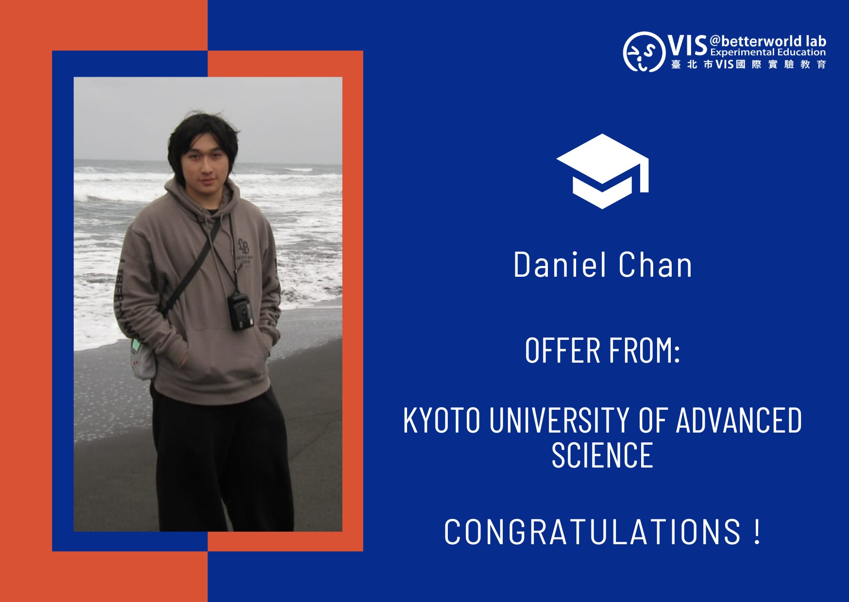We are excited to announce that Daniel Chan, a Grade 12 student at VIS, has been admitted to the Kyoto University of Advanced Science (KUAS) to study Mechanical & Electrical Systems Engineering!