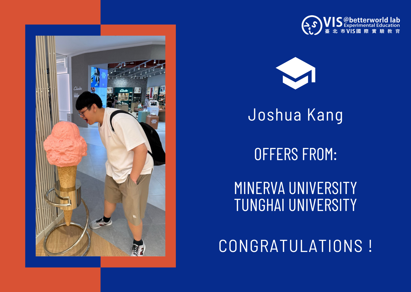 恭喜 VIS G12學生 Joshua Kang成功錄取 美國Minerva University ,以高度選擇性、全球城市學習模式與思維能力訓練聞名,被國際教育界公認為21 世紀最具創新精神的大學之一。