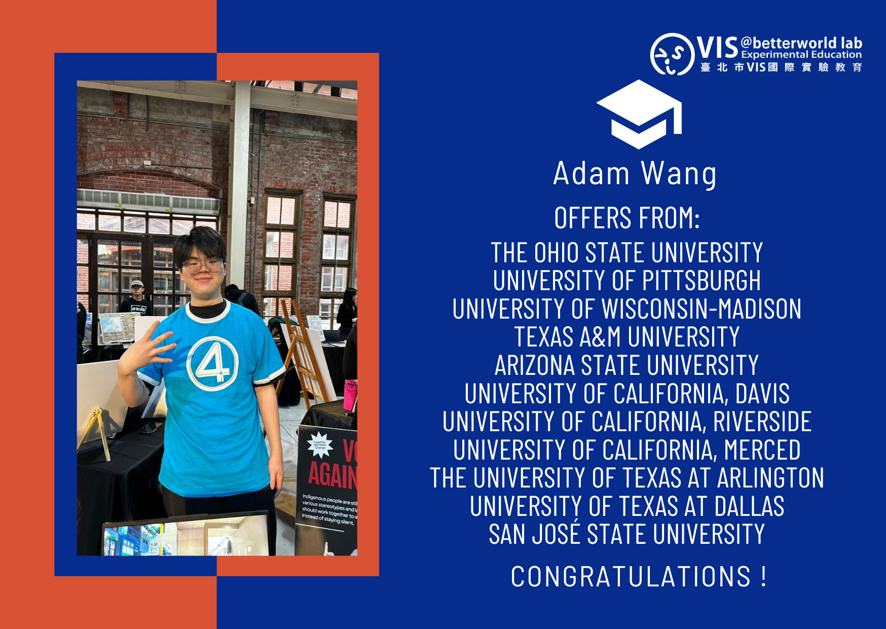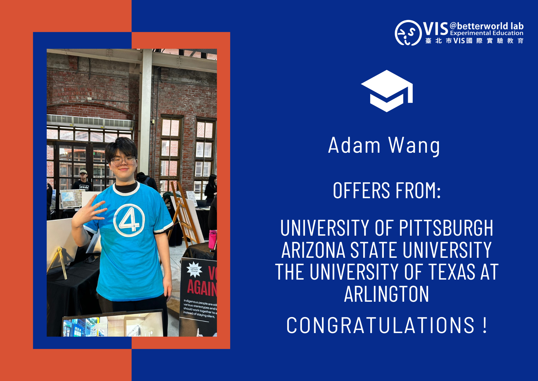 很高興與大家分享:VIS G12應屆畢業生Adam Wang 成功錄取 University of Pittsburgh,並進入其極具國際聲望的 護理學系。