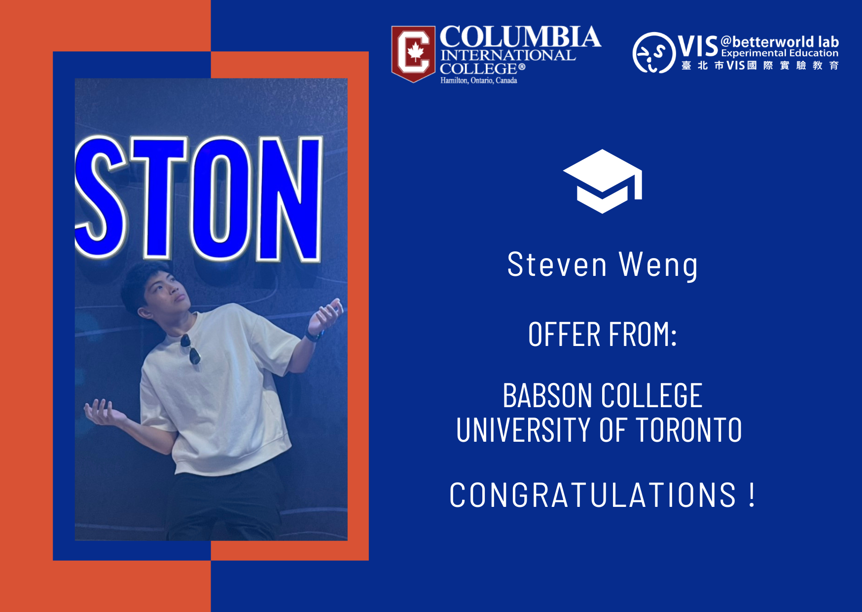 恭喜 VIS 學生 Steven Weng,在加拿大夥伴學校 Columbia International College(CIC)完成 G12 學習後,成功錄取 University of Toronto 多倫多大學,並獲得競爭極為激烈的 #Rotman Commerce #羅特曼商學院 的錄取資格!
