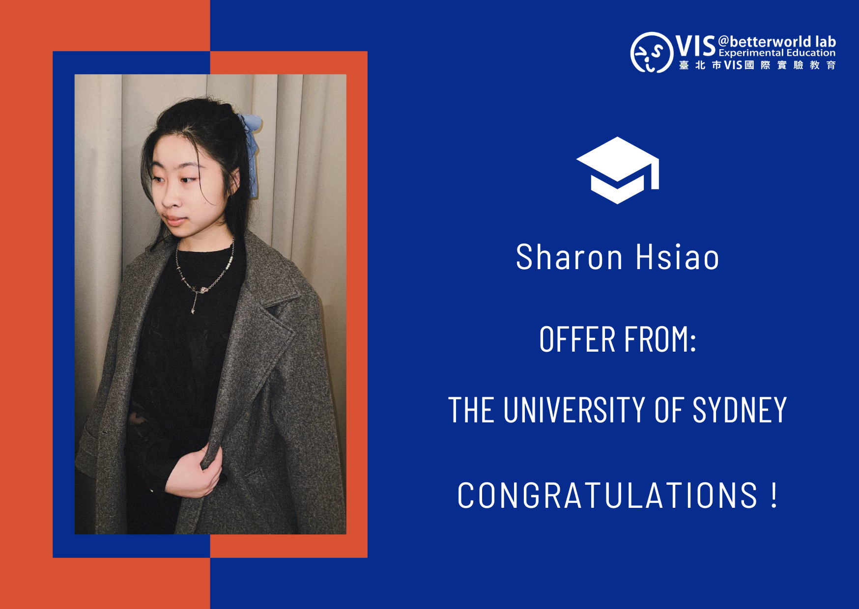 誠摯恭喜 VIS 12 年級學生 Sharon Hsiao 錄取 QS 排名位列 25 的澳洲 #雪梨大學 (University of Sydney) #高級計算學士 (Advanced Computing)。Sharon 長久以來對電腦科學抱有熱忱,而她卓越表現體現出她未來在世界舞臺上綻放光芒的無限潛力。我們引頸以待,見證她精彩可期的人生篇章!