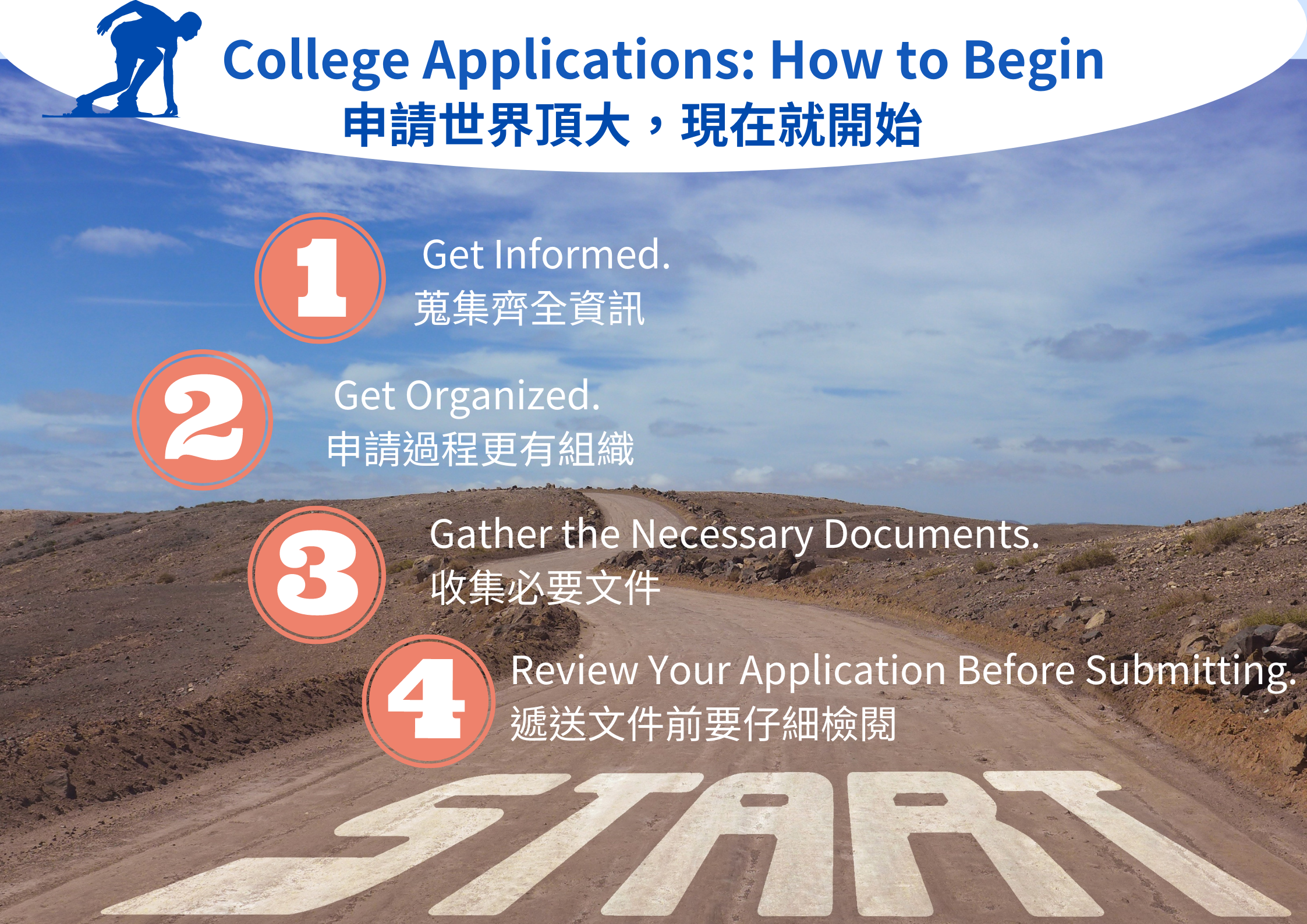 申請時要特別注意申請時間,每所學校的時間都不同,要在中學最後一年或更早就定下各種時程的里程碑、再逐一達到。