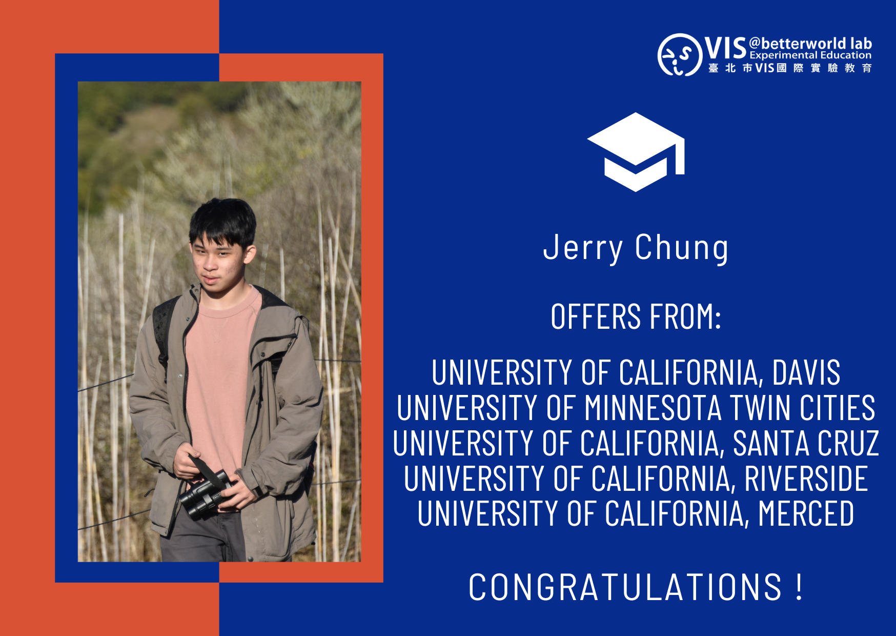誠摯恭喜 VIS 國際實驗教育 12 年級學生 Jerry Chung 獲得多所世界頂尖大學的錄取通知!其中包括Best Colleges US News Ranking #排名33 in National Universities的 #加州大學戴維斯分校(University of California, Davis),主修進化、生態與生物多樣性,並獲得每年 13,250 美元的 Provost's Award;以及明尼蘇達大學雙城分校(University of Minnesota – Twin Cities)生物科學,同時榮獲每年 10,000 美元的 Global Excellence 獎學金。Jerry 亦另外錄取加州大學聖塔克魯茲分校生態演化學(Dean’s Award 每年 15,000 美元)、河濱分校的昆蟲學與默塞德分校的應用數學,展現出他對生命科學、數學領域的深厚熱情與堅定志向。