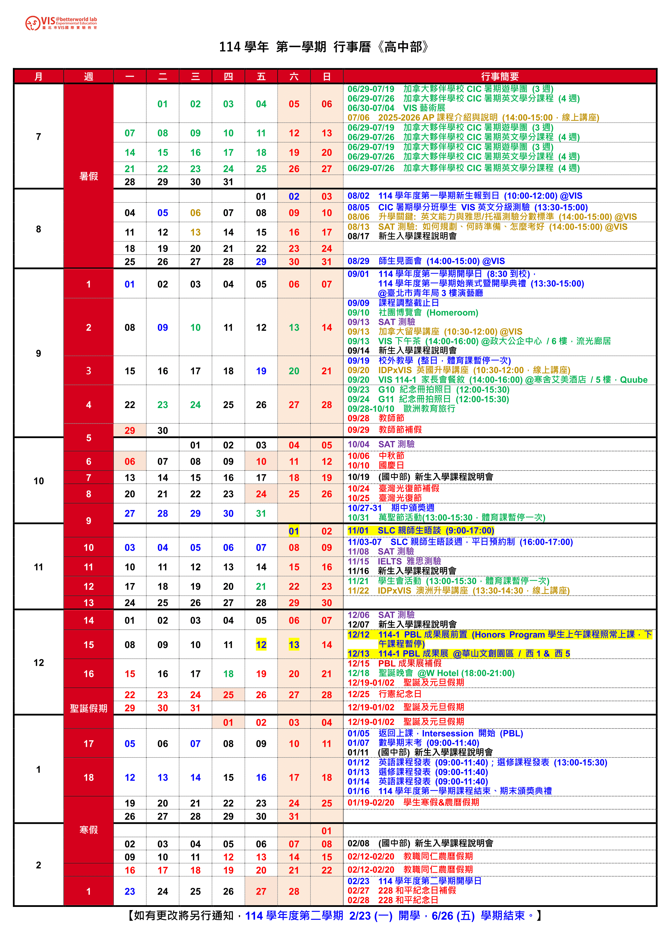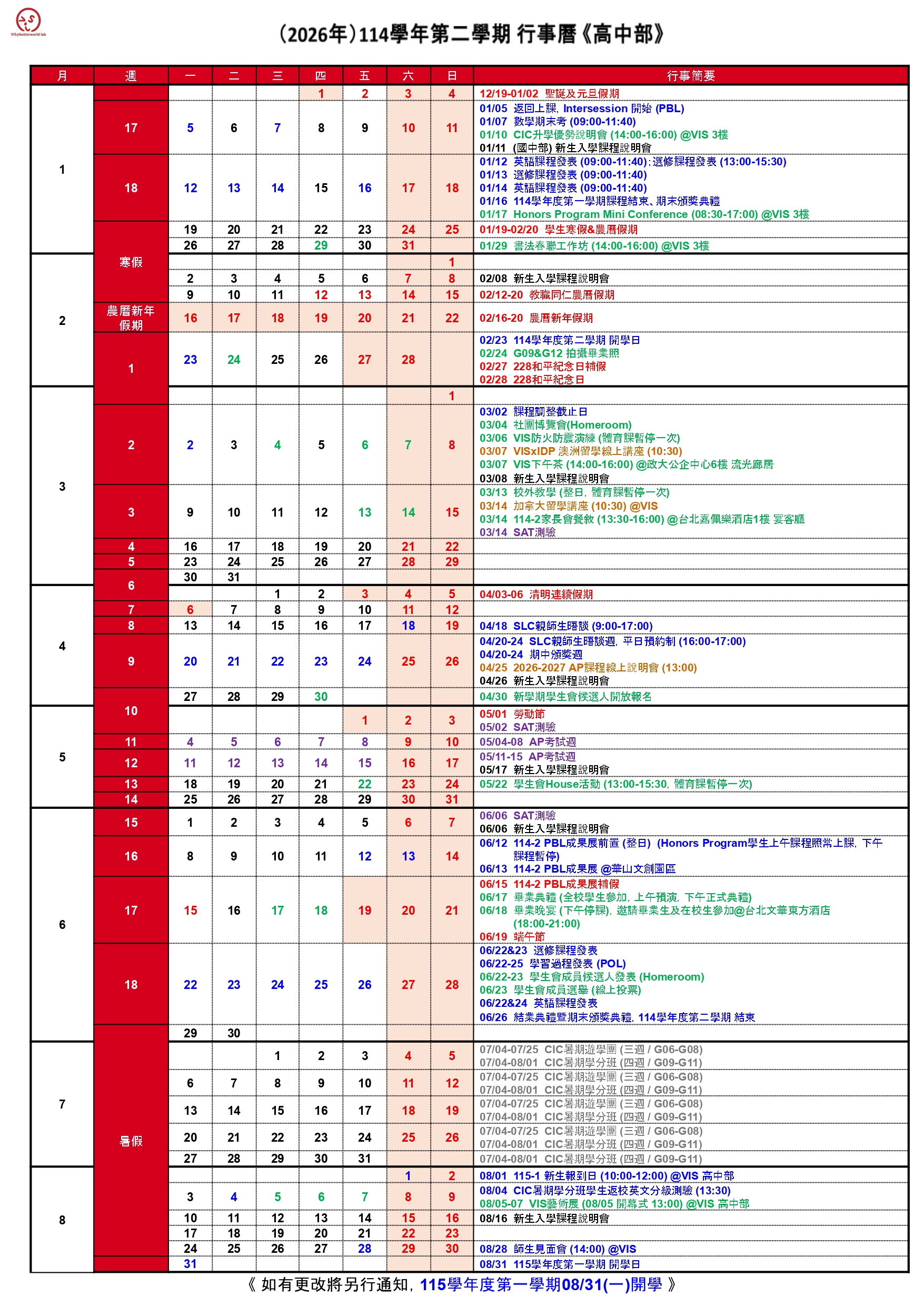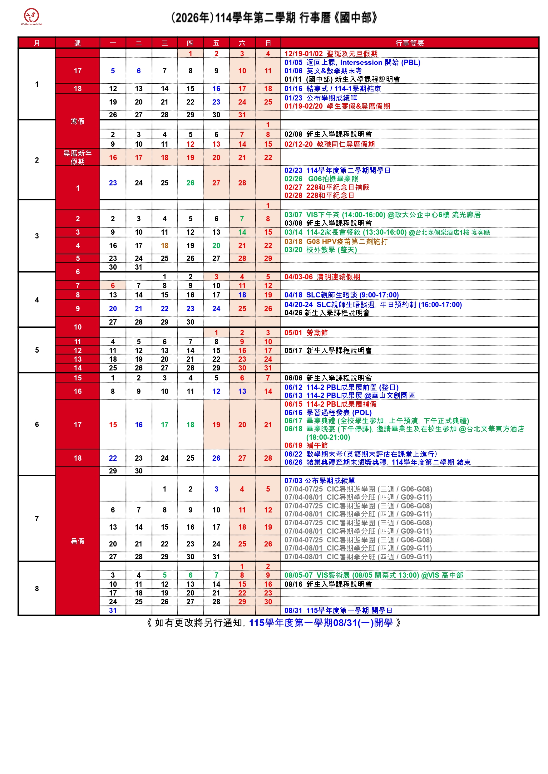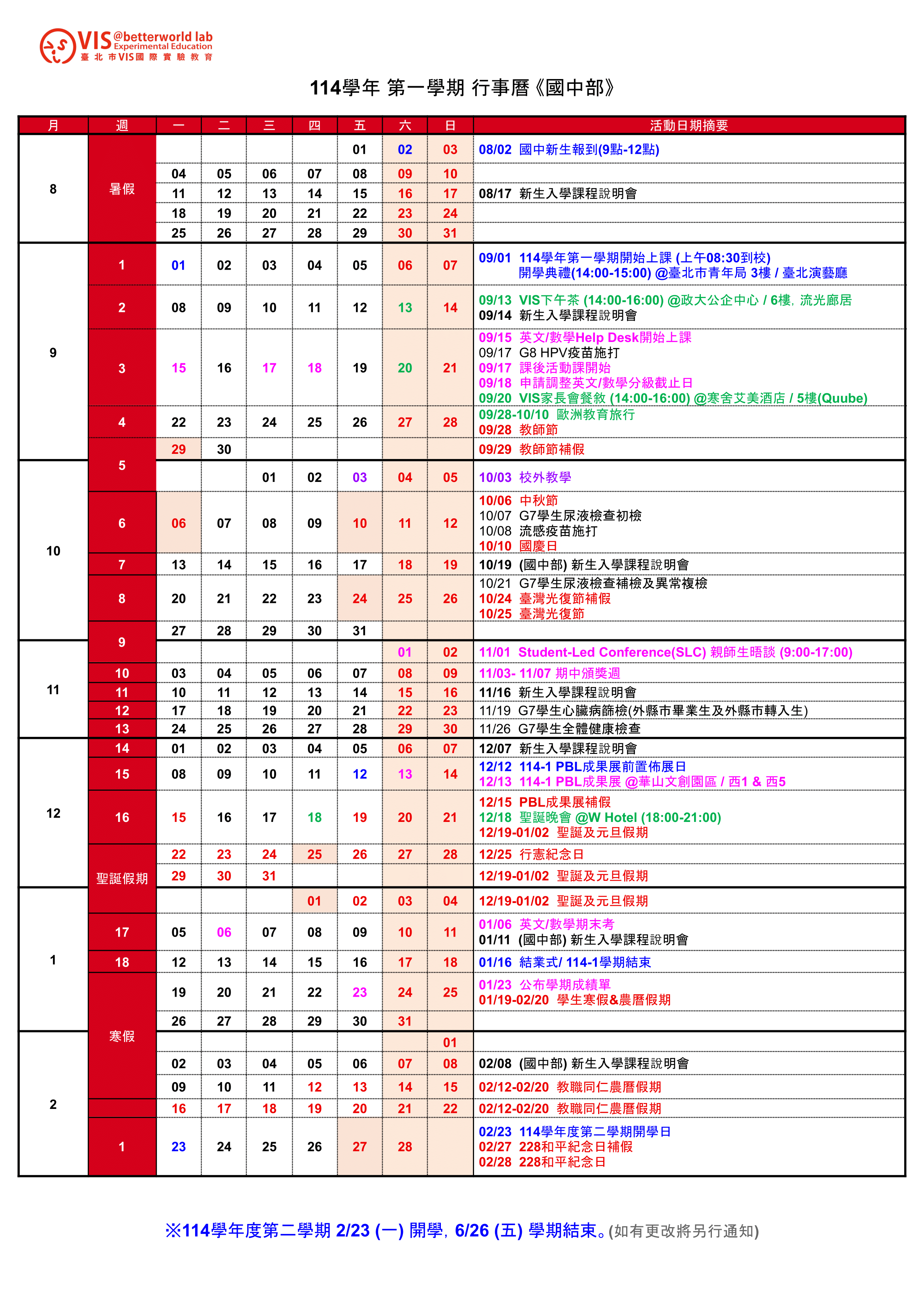VIS 國際實驗教育 高中部/國中部/小學部 G05~G12