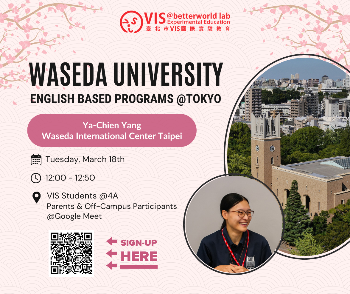 在升學與生涯規劃的道路上,家長的支持至關重要!為了幫助學生更好地探索日本與國際大學的選擇,我們誠摯邀請您參加 #早稻田大學 全英文學程介紹講座。本次講座將由 早稻田大學臺北國際交流中心的楊雅茜 主講,深入解析申請流程與留學資訊。此外,VIS 校友 Andrew 陸思齊 也將親自分享他的早大就讀經驗,帶給學弟妹最真實的學習心得與建議。