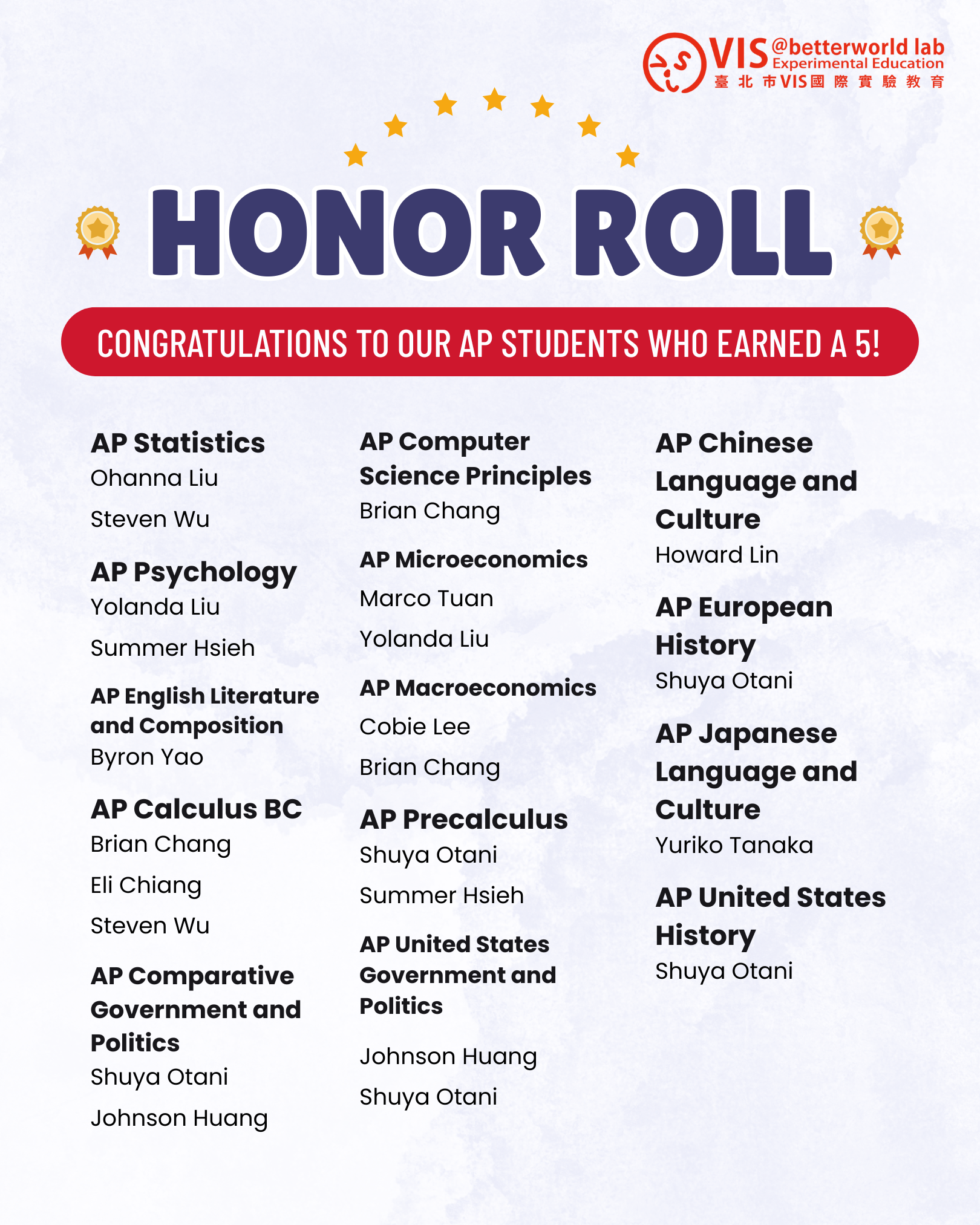 今天,我們繼續表揚 VIS 學生在 AP 考試中榮獲滿分 5 分佳績!你們的努力不懈、全心投入與堅持到底並開花結果。恭喜你們!