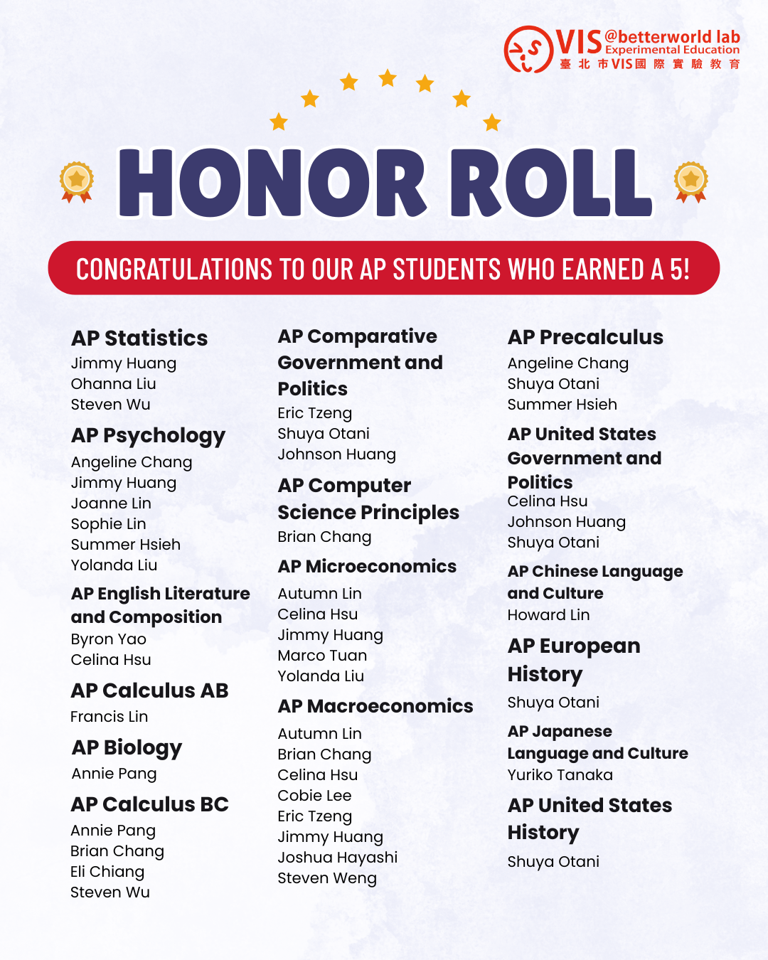 今天,我們表揚所有在 AP 考試中榮獲滿分 5 分佳績的 VIS 學生!你們的努力不懈、全心投入與堅持到底並開花結果。恭喜你們!