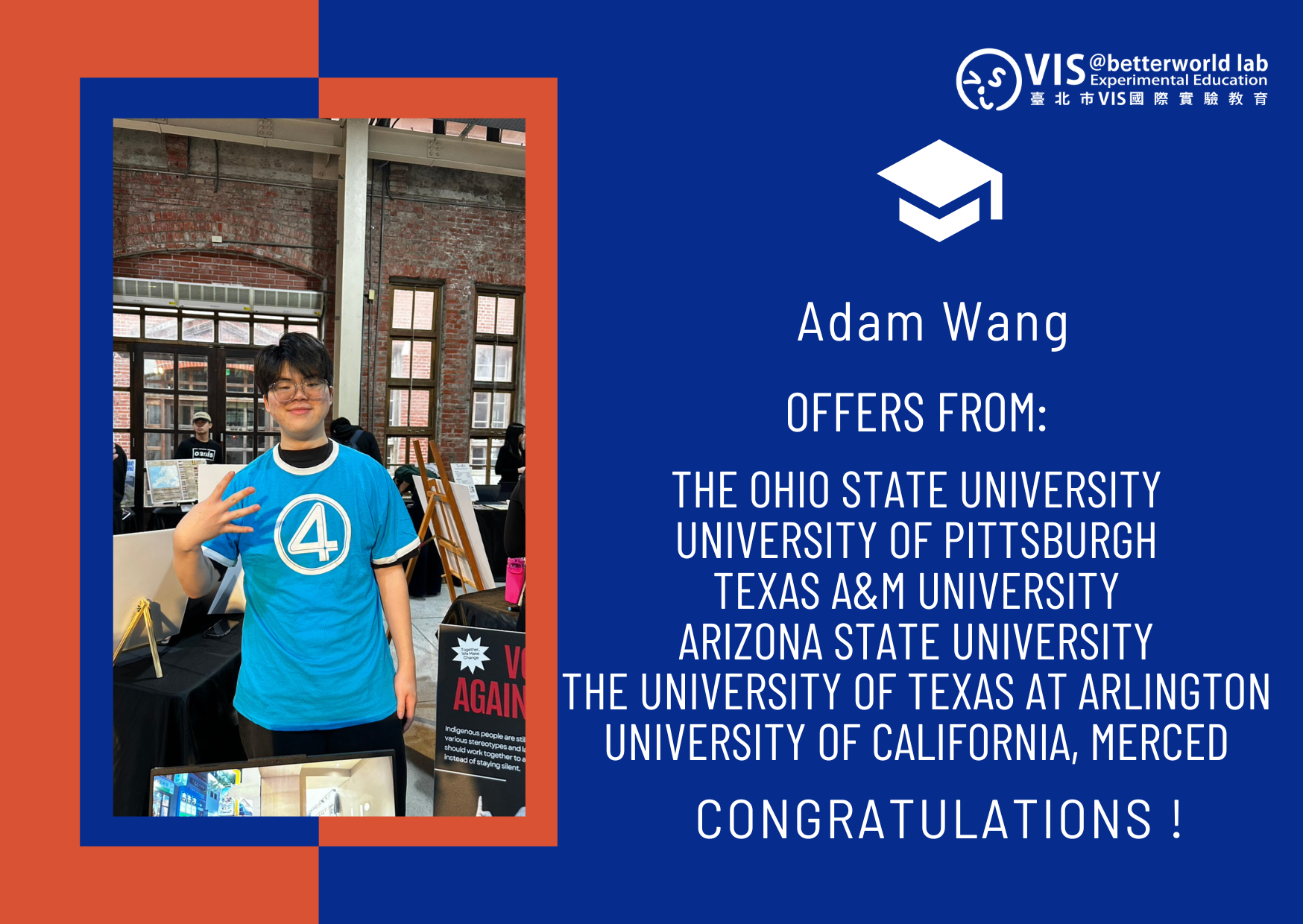 很高興與大家分享:VIS G12應屆畢業生Adam Wang 成功錄取 University of Pittsburgh,並進入其極具國際聲望的 護理學系。