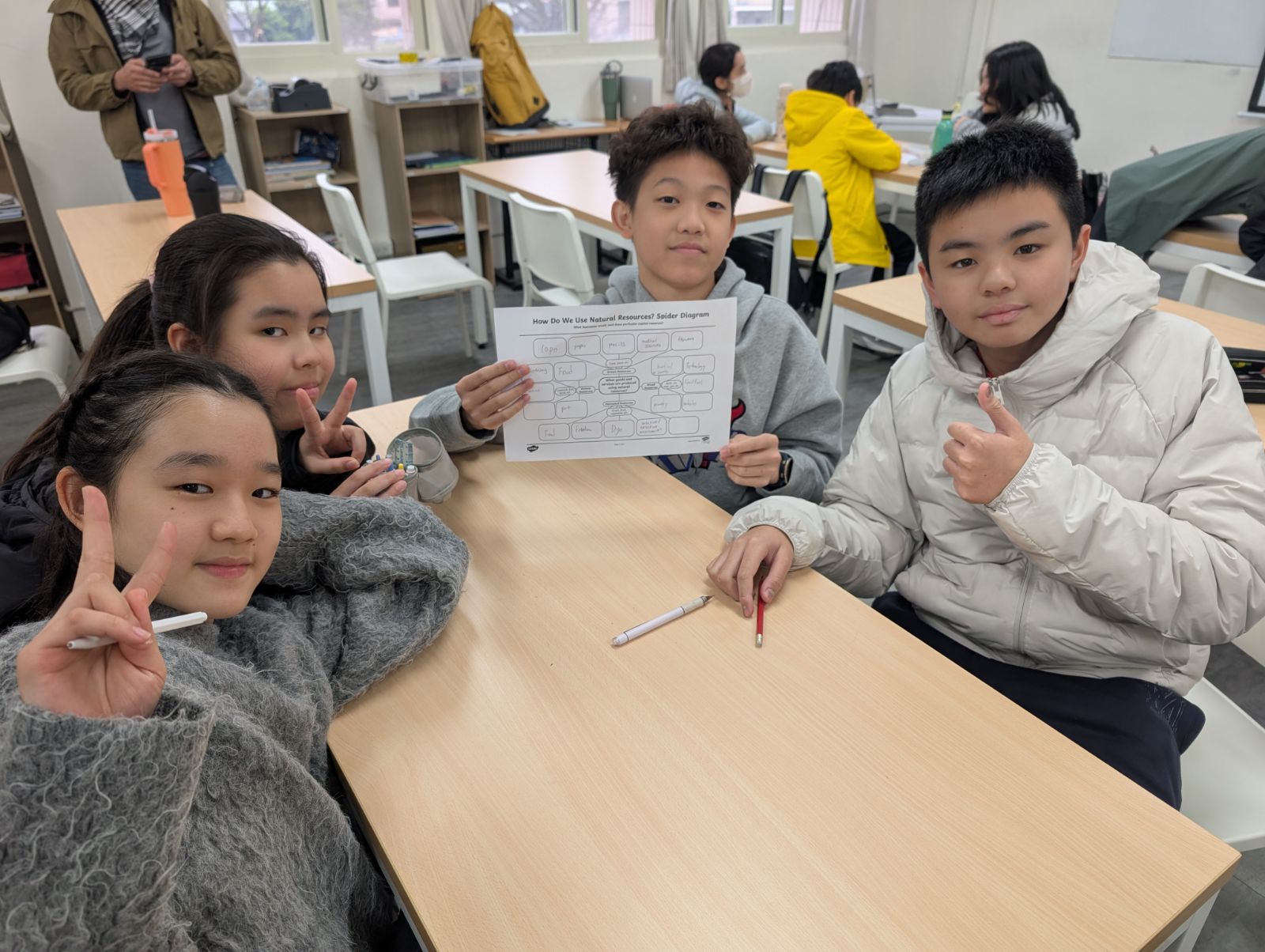 同時,在 Mr. Rowles 與 Mr. Sotomayor 的課堂中,G7 學生分組利用蜘蛛網概念圖,討論如何善用不同自然資源。透過視覺化的思考工具,學生得以梳理想法,並將課堂知識與現實世界的議題相互連結。