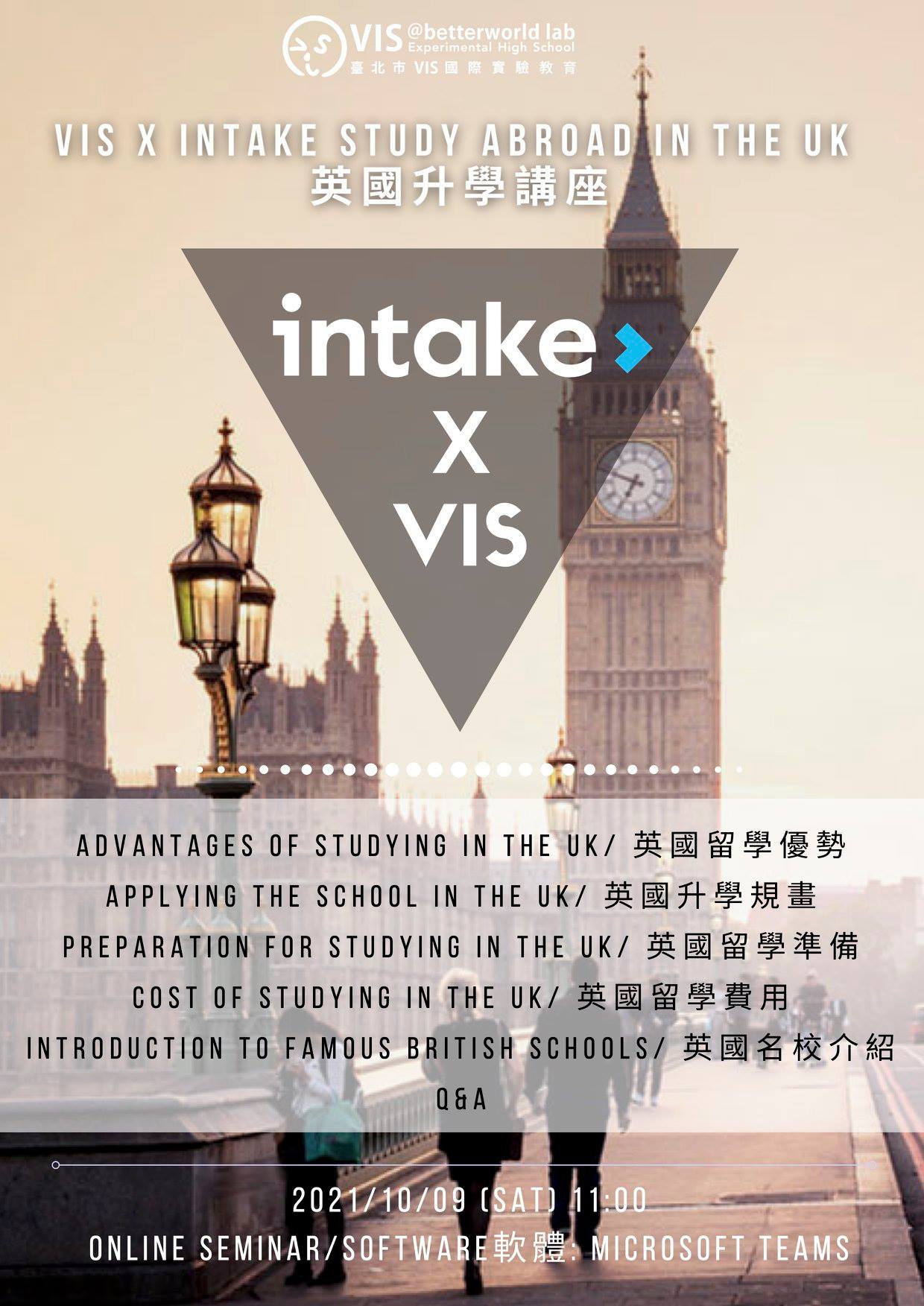 VIS特別邀請intake國際留學教育集團舉辦一場線上英國升學講座,歡迎對英國升學有興趣的家長、同學報名參加!