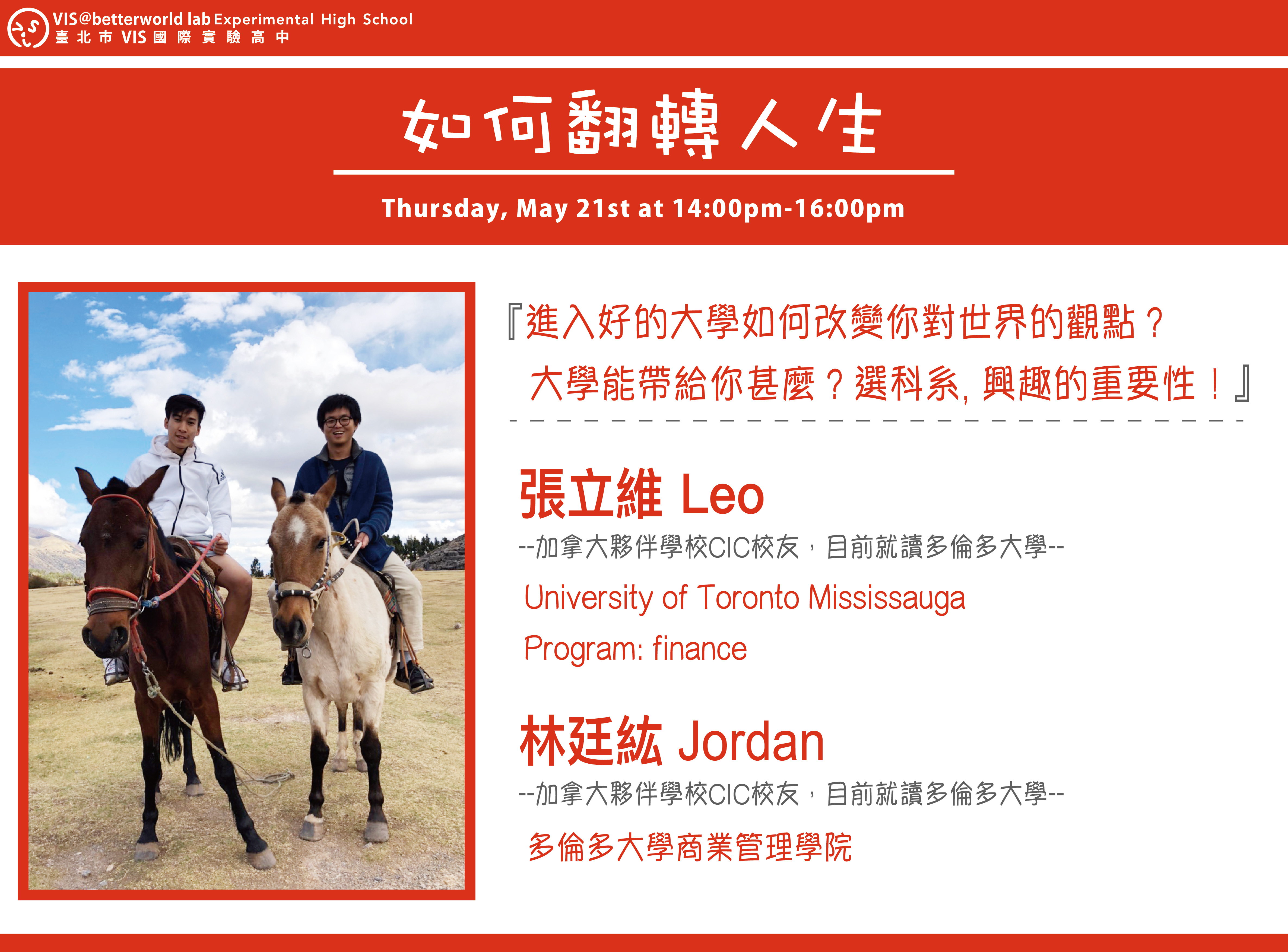 VIS歡迎目前就讀多倫多大學的兩位來自加拿大夥伴學校CIC的學長,Leo and Jordan將分享選科系和興趣的重要性,大學能帶給你甚麼收穫?為什麼高中要好好努力進入好大學?還要給學弟學妹們一些小技巧喔!