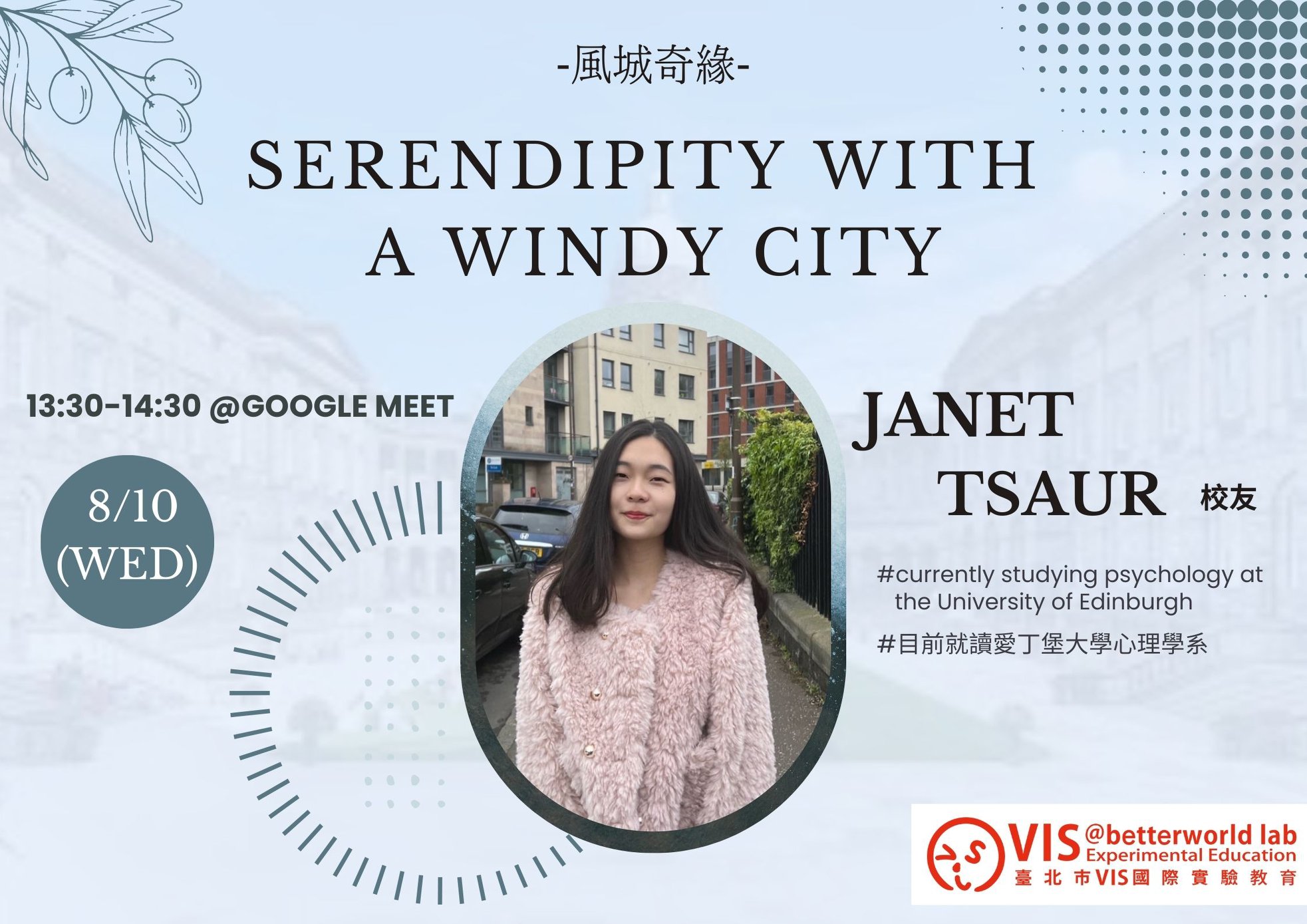Janet 目前是 #愛丁堡大學心理學系 的學生。如果需要任何跟大學有關的事情或只是想聊聊,歡迎與她聯繫。