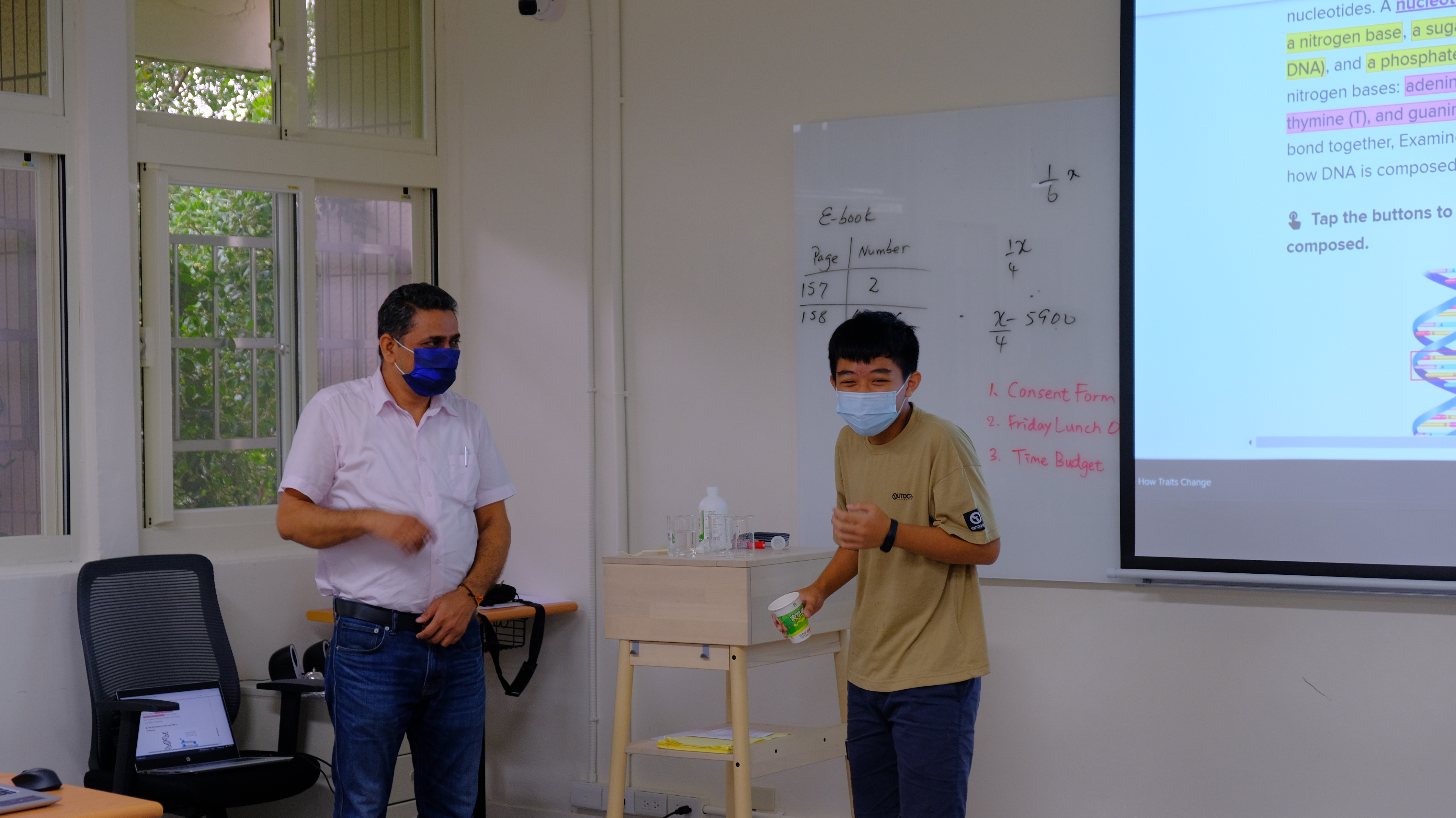 自然課上Kumar老師帶了三個量杯,讓同學摸不著頭腦,這是一個有趣的自然實驗,用來實際看見我們的DNA,首先學生將60%酒精、平衡塩溶液、兩滴洗碗精攪拌,然後漱口,吐出來後等待一陣子,就可以看到白色的DNA證明了!在Joshua同學的幫助下,透過實驗讓感覺遙遠的科學瞬間有趣了許多。