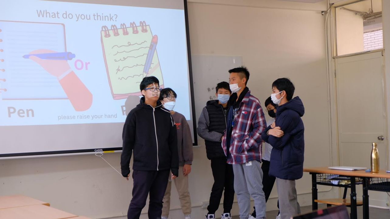 "Pen or pencil, what's your preference?" One of the ideas our students came up with for our PBL project on "Mindful Consumption." Today in class, students formed groups and presented their ideas to each other, giving public speeches. Take a look at these photos to see their hard work paying off!