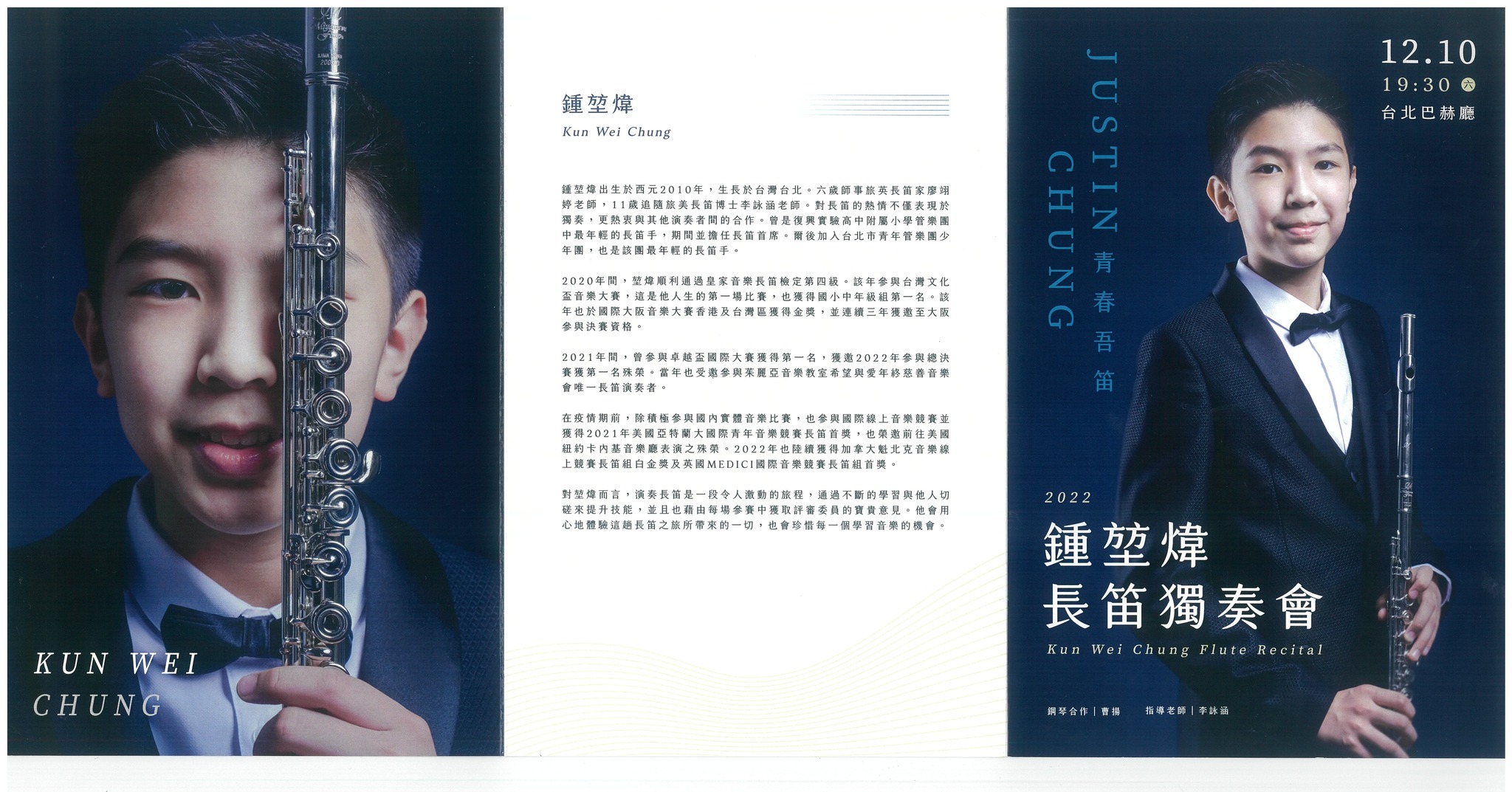 On Saturday night, Justin’s Flute Recital took place in the Taipei Bach concert hall, and beautiful music surrounded the hall. The last encore song, “You Raise Me Up”, made people's eyes well up.