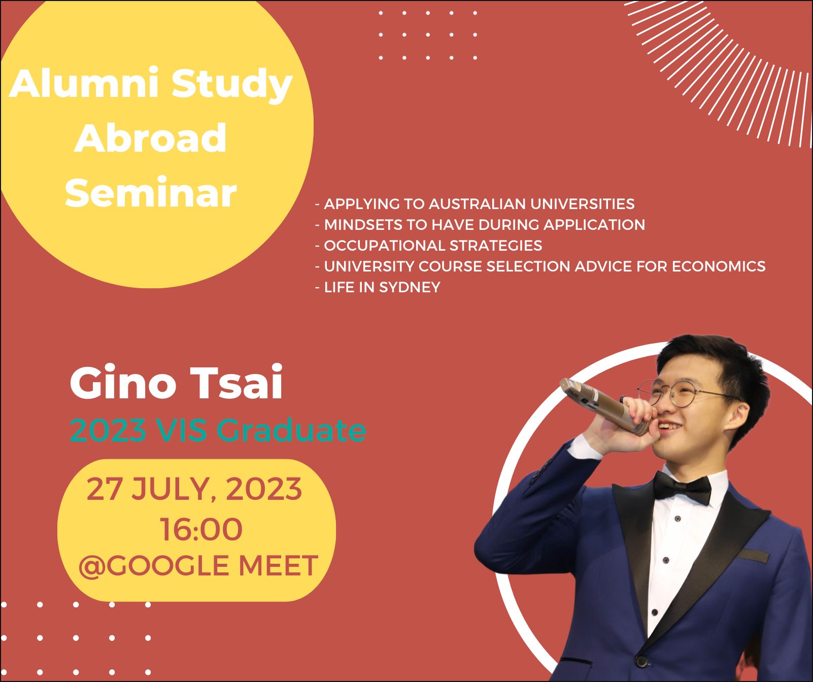 Gino, a distinguished alumnus from VIS, will be hosting a study abroad sharing session at the University of Sydney! The event is scheduled for July 27th (Thu) at 16:00 and will be held on online Google Meet.