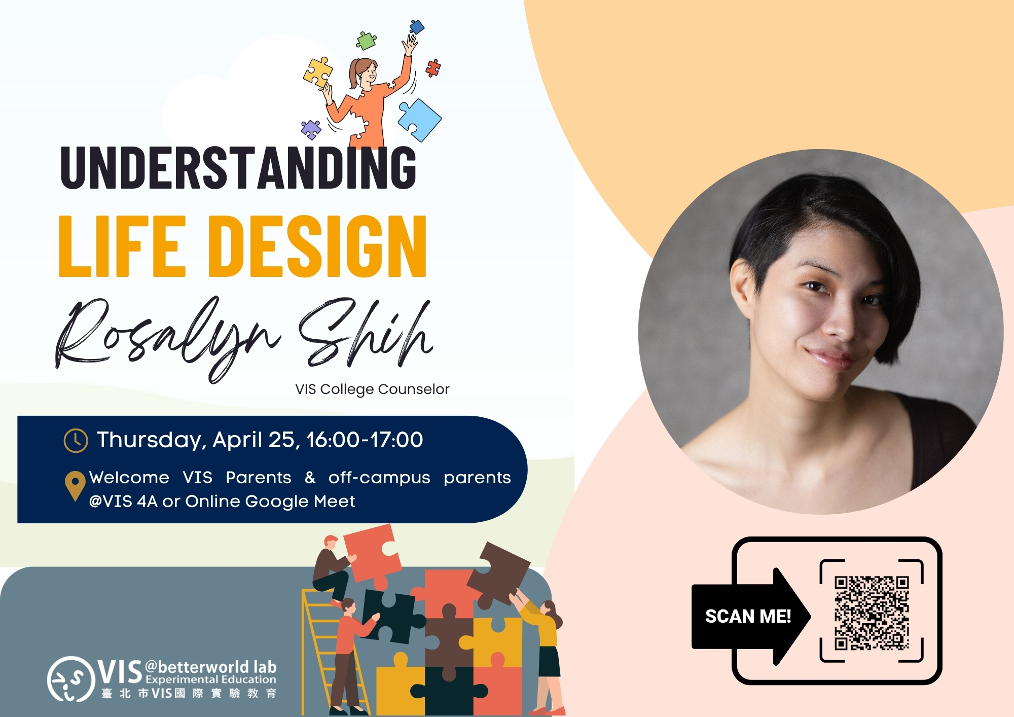 Life Design is a creative human-centered problem-solving method for tackling life problems developed by Stanford University’s Life Design Lab. From understanding priorities to prototyping career paths, Life Design offers a practical framework for shaping a fulfilling and meaningful life. At VIS, we teach Grade 11 students Life Design as a tool to help map their future paths from high school to college and beyond. In this presentation, we will cover the Life Design process taught to students in the second semester of Grade 11. We will also offer parents suggestions on how to support students as they explore their options in their college and career research and planning.