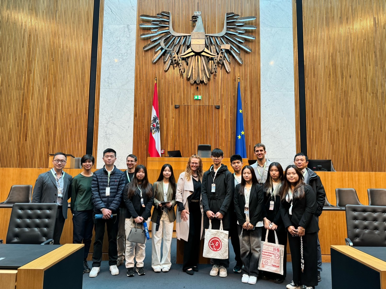 As the VIS 2024 European Educational Trip progresses, VIS students visited Parlament Österreich (Parliament of Austria) in the morning of Oct 2 and followed a tour by the parliament member Fiona Fiedler of the NEOS party. Inside the spectacular parliament building was a total of 1.600 rooms. What is greater than the number of rooms in the parliament is the number of details contained; the handles of the doors were the shapes of lions and snakes, sometimes with the carved words of “FJI” (stands for Franz Joseph I) on the ceilings. While following Ms. Fiedler scurrying around the building, I was amazed by the rooms that all served distinct functions, as well as the small “backstory” behind each room.