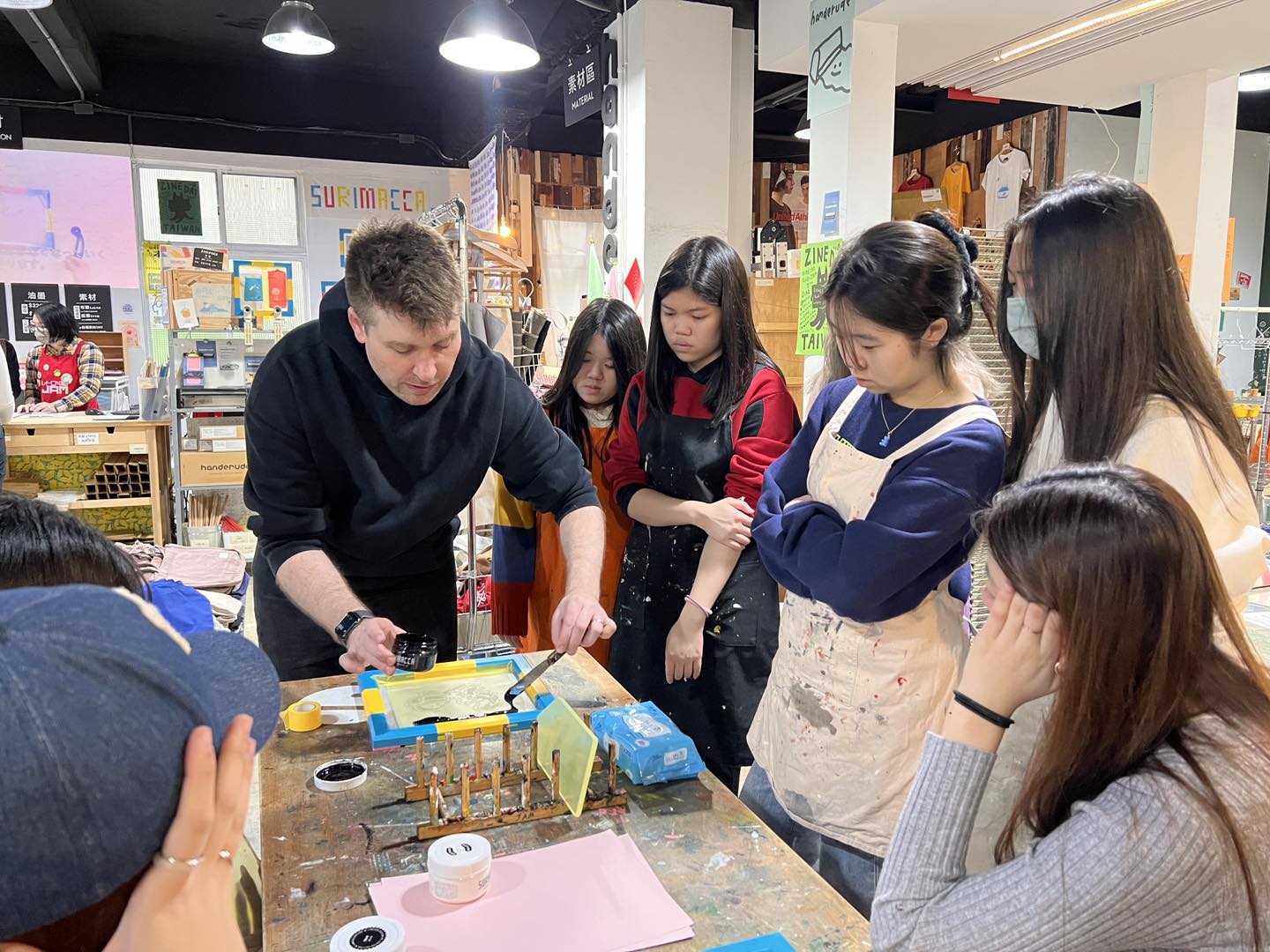 在 Austin Brigman 先生的帶領下,學生們前往 Retro Jam 親身體驗絲網印刷的全過程。他們從設計作品、製作網版、塗抹油墨,到最後在紙上印出色彩鮮明的圖案,逐步掌握了這門技藝。這次實作不僅讓他們學到實用的印刷技巧,更促進了彼此間的合作,激發出全新的藝術靈感。通過嘗試不同的技法和色彩,這群懷抱夢想的年輕藝術家學會了如何將創意轉化為鮮活的紙上作品。