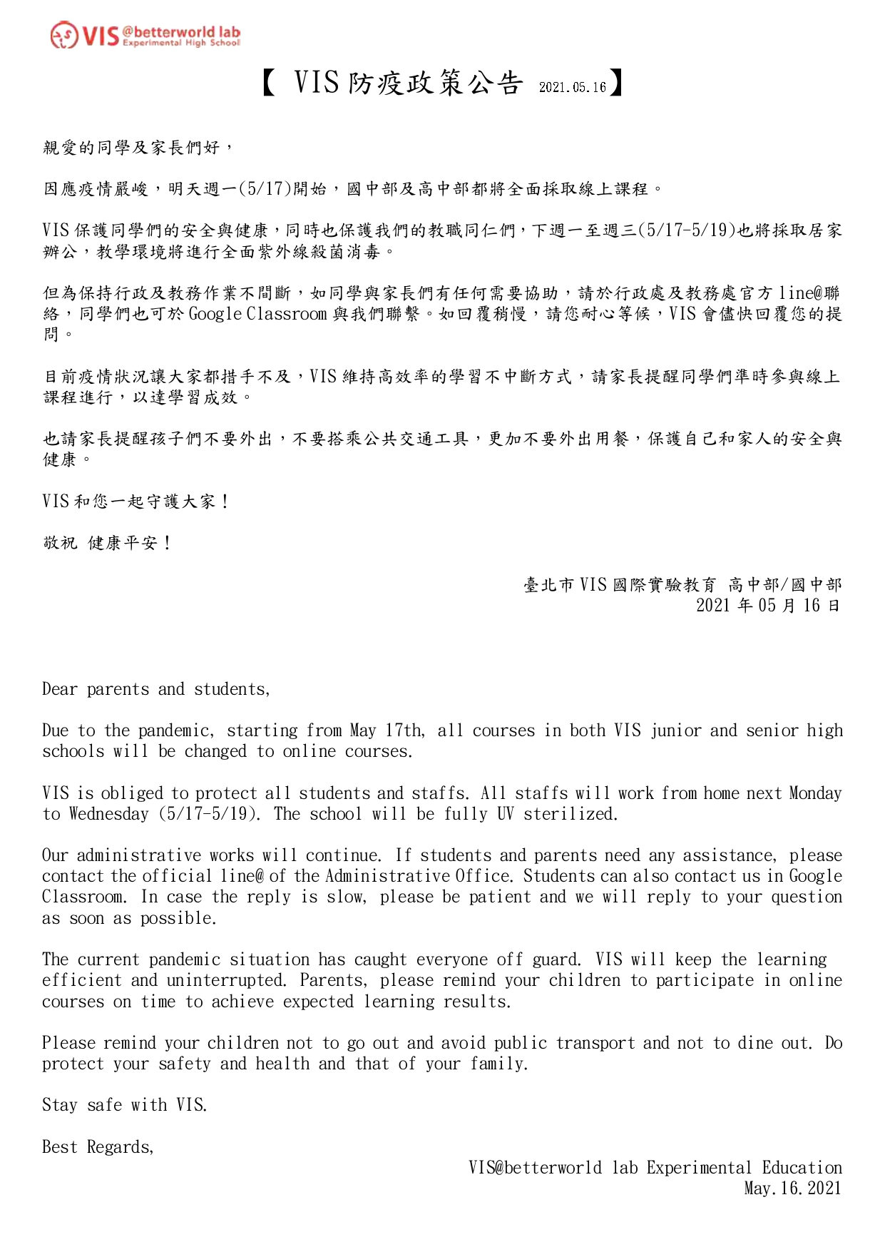 VIS 國際實驗教育 高中部/國中部/小學部 G05~G12