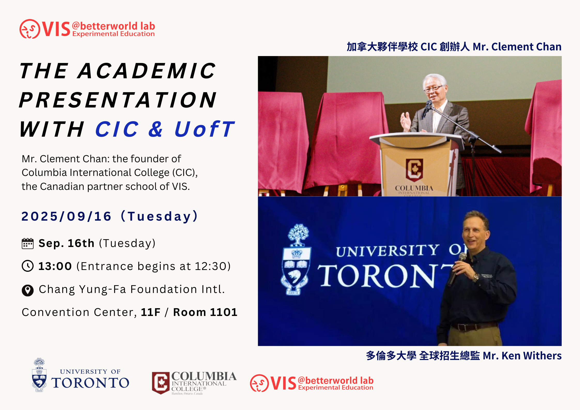 Mr. Clement Chan, the founder of Columbia International College (CIC), the Canadian partner school of VIS, and Mr. Ken Withers, the director of university student recruitment of the University of Toronto (UofT), specially arranged a visit to Taiwan to deliver an academic lecture to VIS parents and students. We sincerely invite parents from both within and outside the VIS to join this event.
