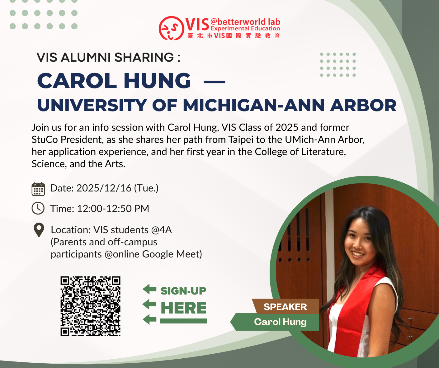 歡迎參加這場大學分享講座!主講人是 VIS 校友、2025 屆畢業生、同時也是前學生會會長的 Carol Hung。她將向大家分享從臺北前往美國安娜堡求學的歷程,以及在密西根大學(University of Michigan)度過的第一年生活。