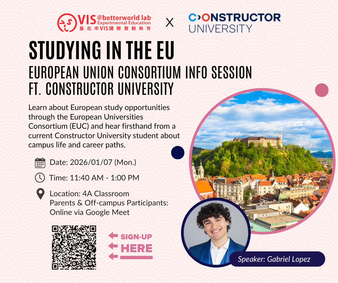 該聯盟由分布於歐洲各地的 7 所大學 組成,致力於提供學生多元且具國際視野的高等教育選擇。本次活動特別邀請目前就讀於 Constructor University 的在學學生 Gabriel Lopez,親自分享他的校園生活、學習經驗,以及未來職涯發展的方向,協助同學與家長更全面了解歐洲大學的學習環境與優勢。