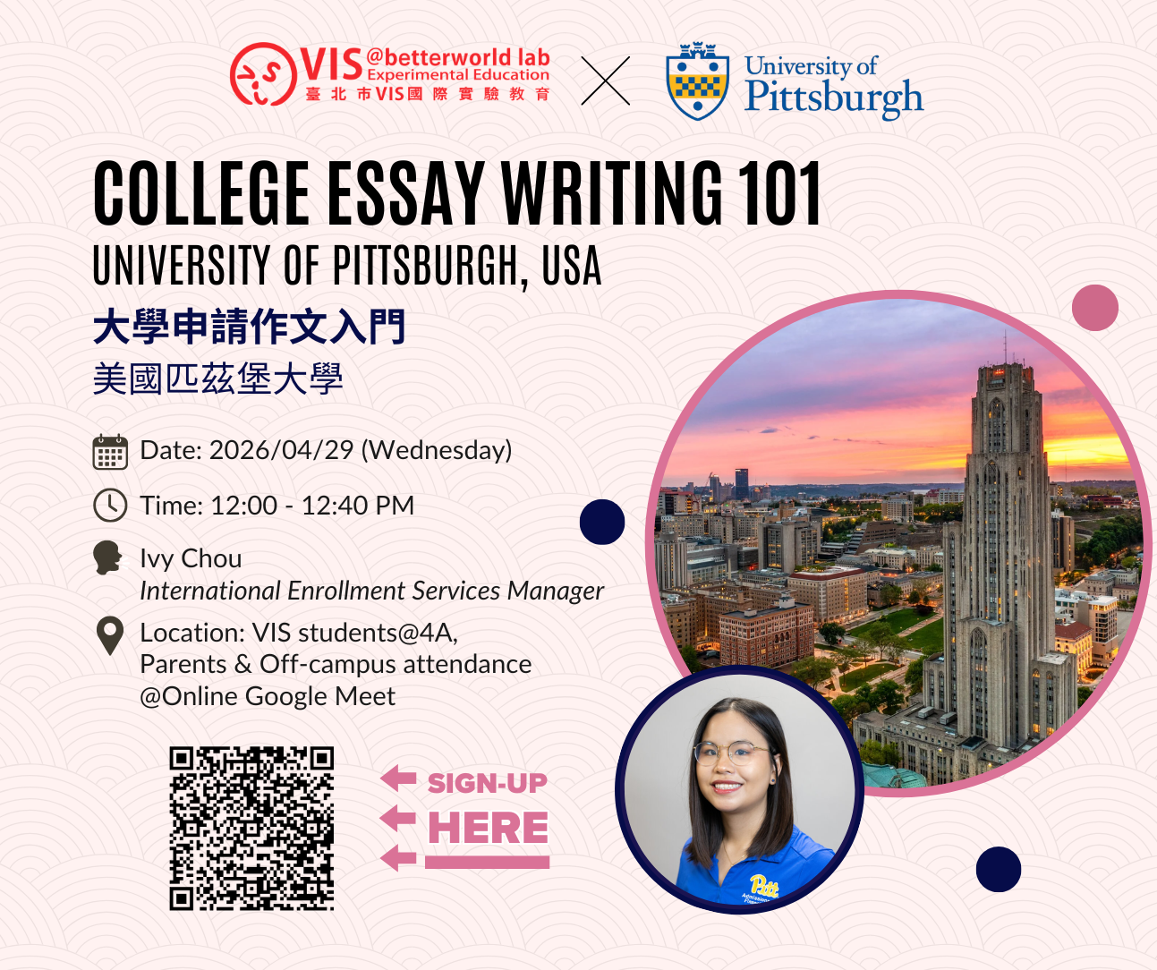 本次特別邀請來自美國匹茲堡大學的招生代表 Ivy Chou,結合過去國際學生的經驗與實務審查觀點,帶領同學了解: