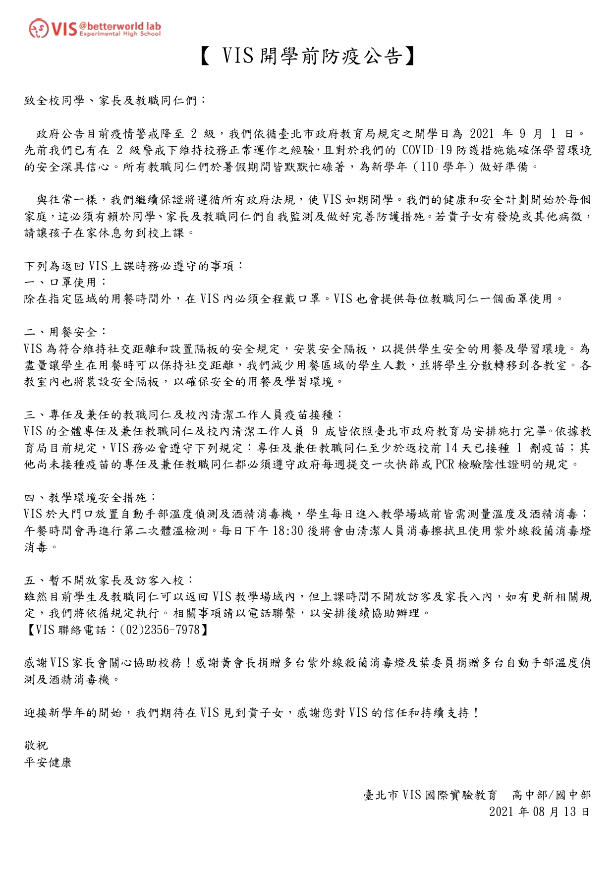 VIS 國際實驗教育 高中部/國中部/小學部 G05~G12