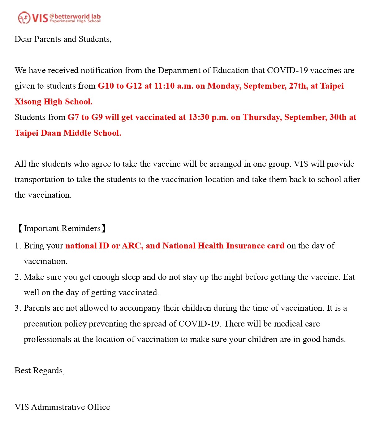 VIS 國際實驗教育 高中部/國中部/小學部 G05~G12