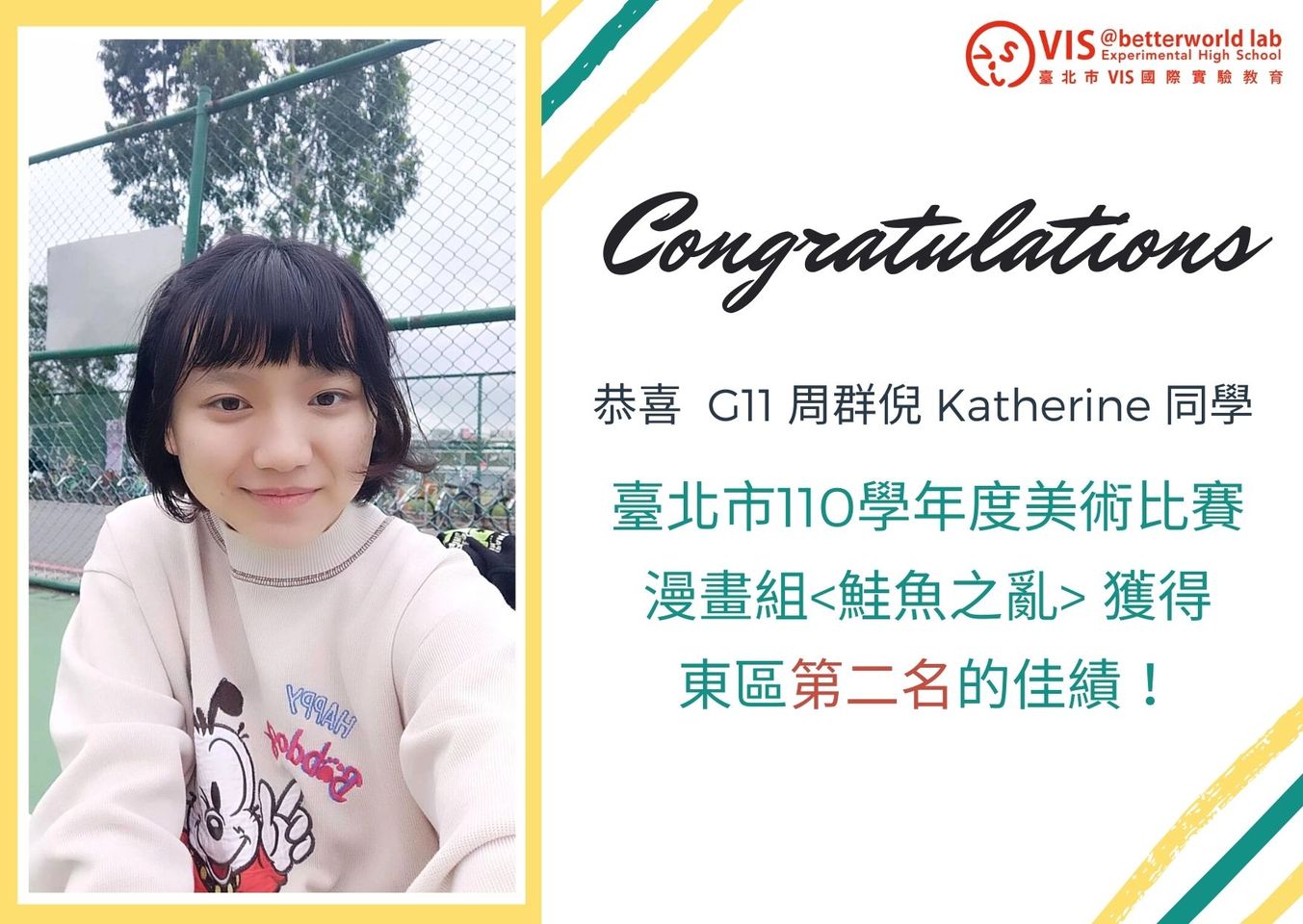 恭喜G11 周群倪 Katherine Chou 同學,