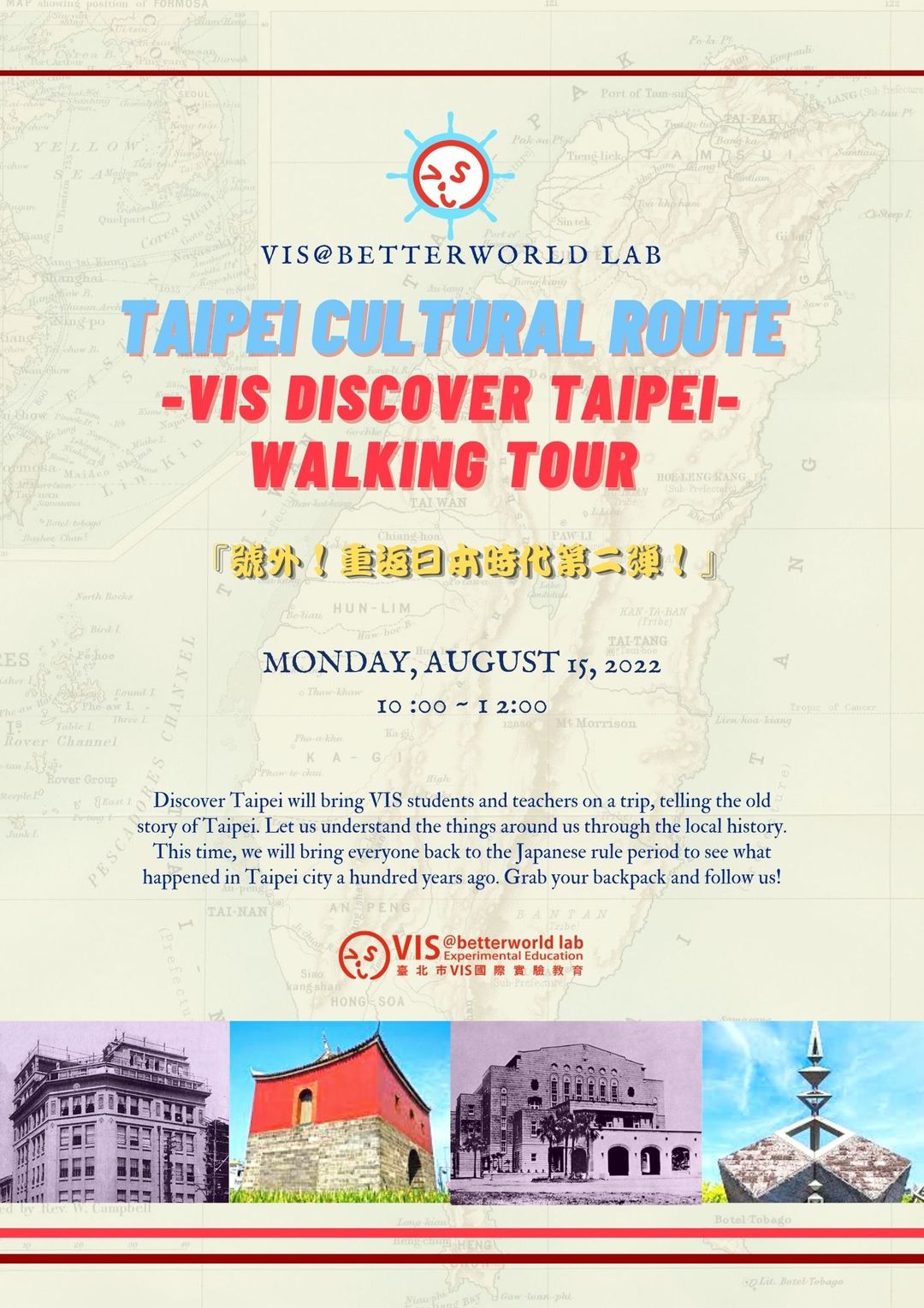 Discover Taipei will bring VIS students and teachers on a trip, telling the old story of Taipei. Let us understand the things around us through the local history. This time, we will bring everyone back to the Japanese rule period to see what happened in Taipei city a hundred years ago. Grab your backpack and follow us!