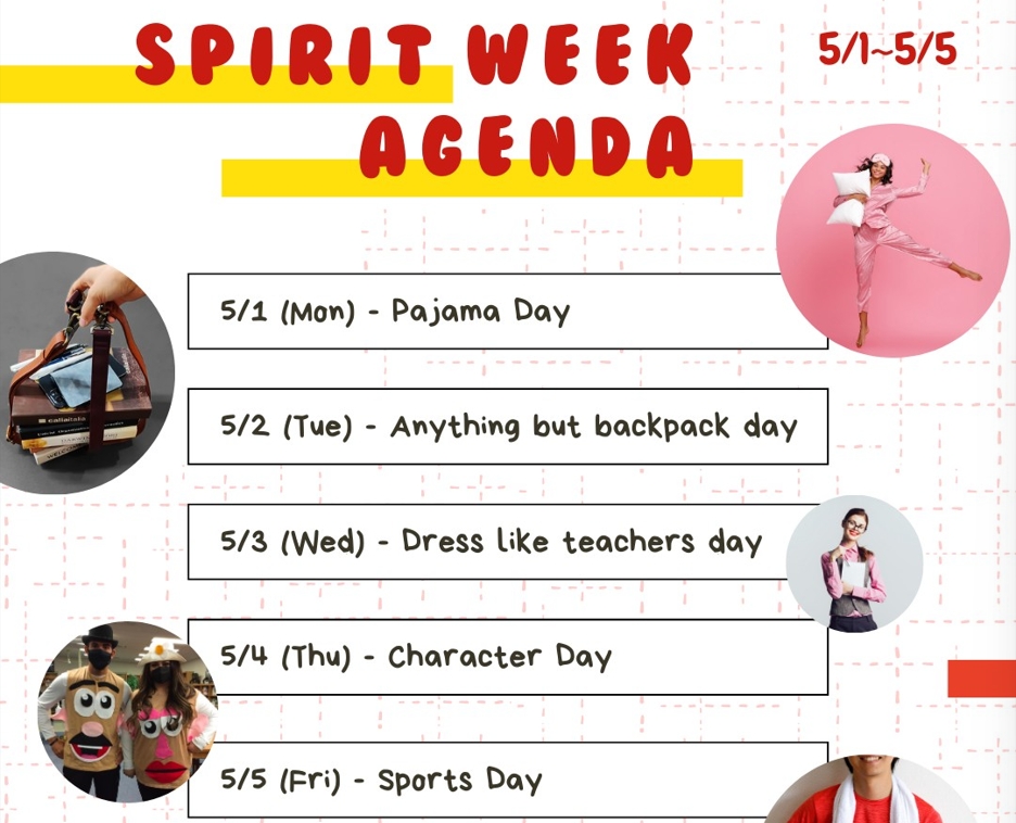 5/1-5/5 是我們的 spirit week!Student Council 為大家準備一個禮拜的裝扮主題和活動。